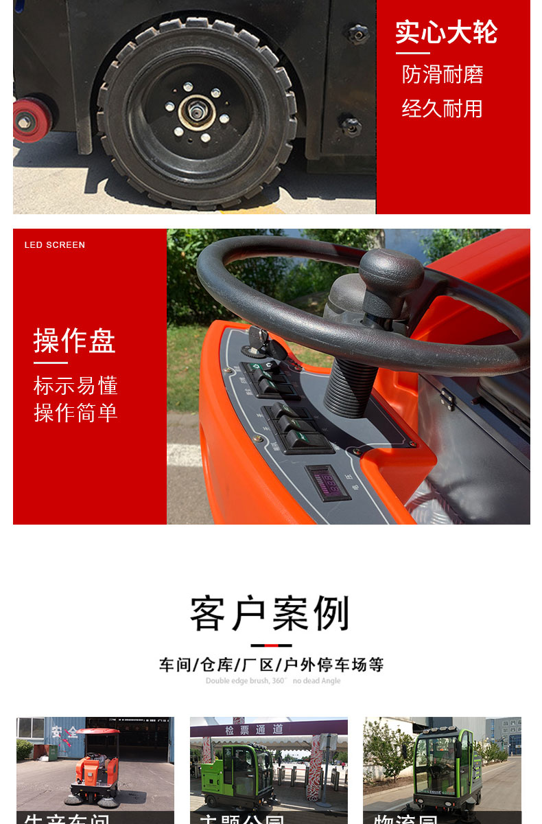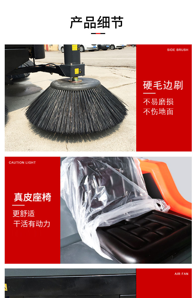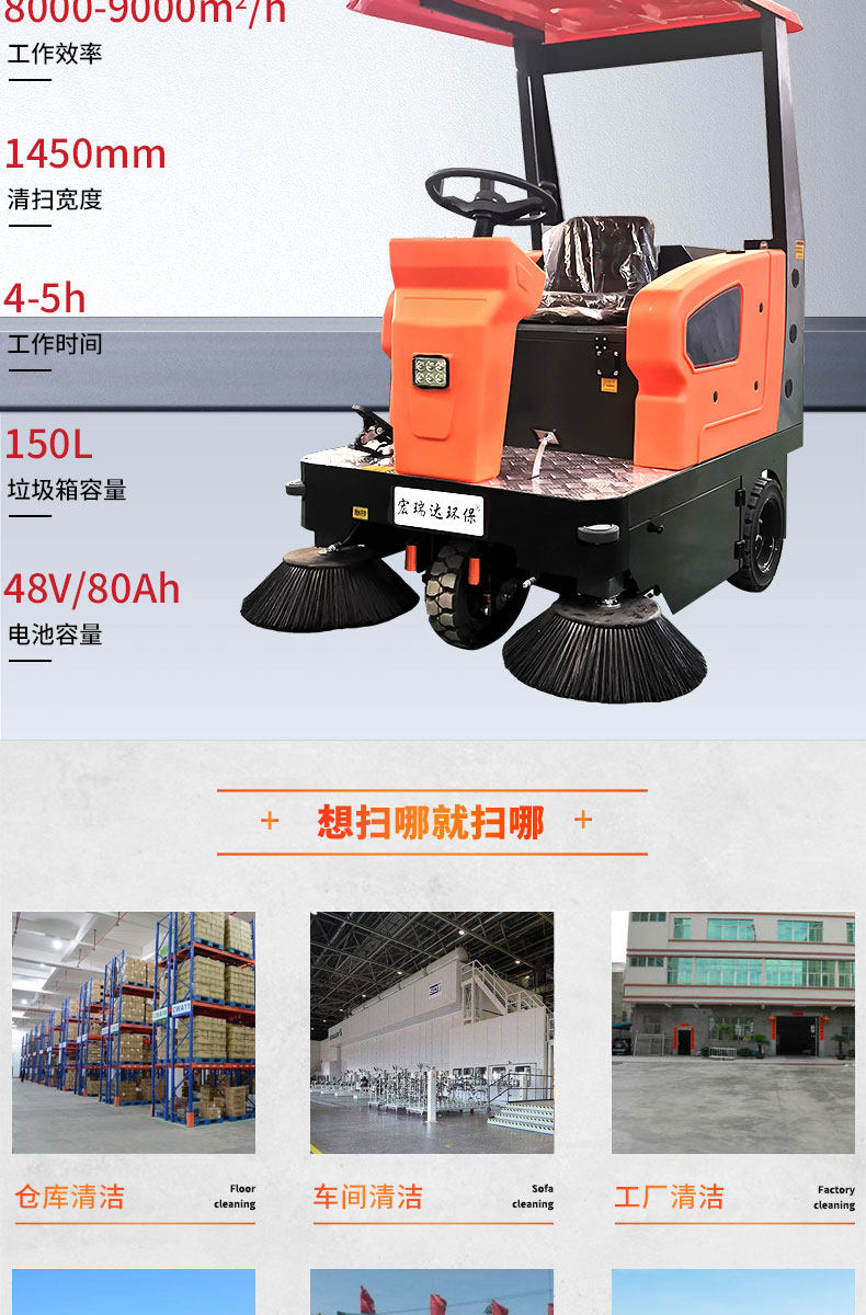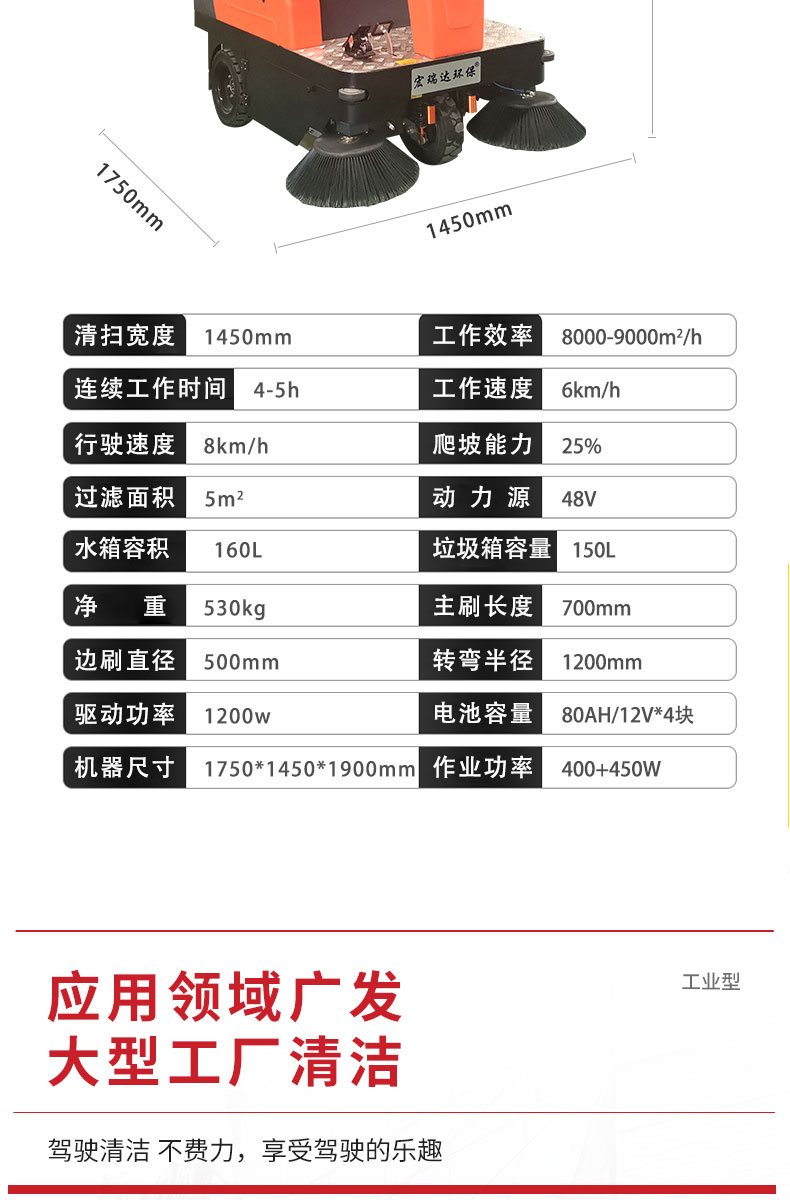 HRD-1450半封閉駕駛式掃地車160L大容量水箱,轉彎半徑小,方便靈活,清掃寬度可達1450mm,可連續(xù)工作4-5小時,灰塵 石子 落葉 煙頭煙灰 木屑 瓜果等一掃而凈,特別適合煤礦、水泥廠、雕刻廠、面粉廠、建材廠、金屬冶煉廠、工廠車間、商場、車站、學校、機場外圍、廣場公園、景區(qū)等場所使用。