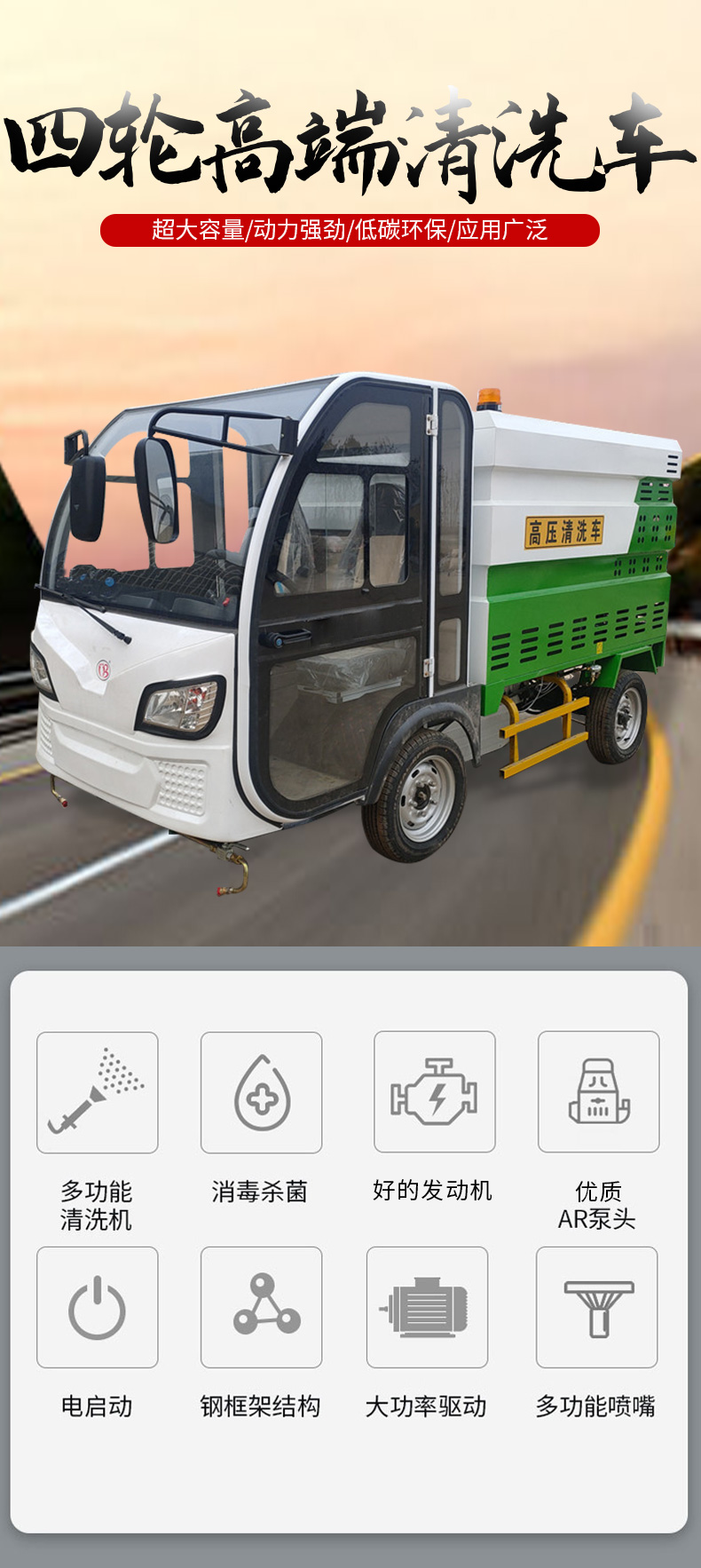 高端清洗車,主要用于城市人行道、輔道、路沿石的快速?zèng)_洗和保潔,以及城市小廣告清