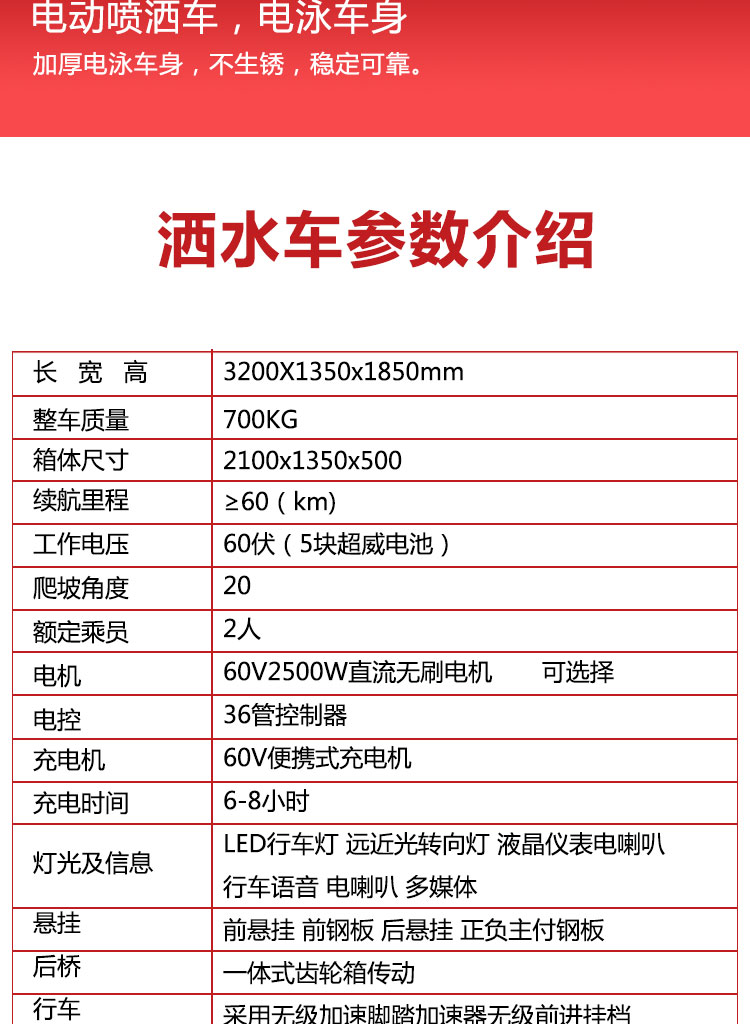 - 電動(dòng)灑水車是一款新型多功能灑水車,該產(chǎn)品具有多種功能,節(jié)能低碳,造型美觀,價(jià)格低廉,小巧輕便非常適合建筑工地和小區(qū)物業(yè)除塵使用,是一種理想的非公路行駛的電動(dòng)灑水車。