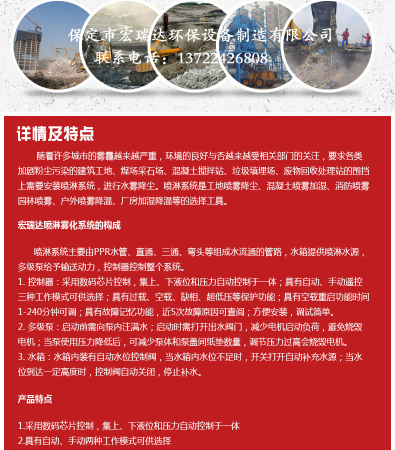 - 圍擋噴淋系統(tǒng)的構(gòu)成是由PPR水管、直通、三通、彎頭等組成水流通的管路,水箱提供噴淋水源,多級泵給予輸送動力,電腦控制器控制整個系統(tǒng)。