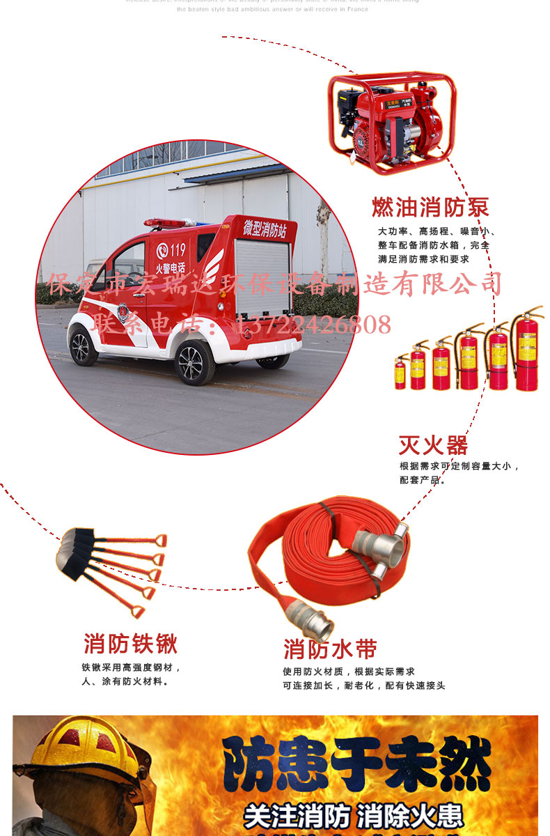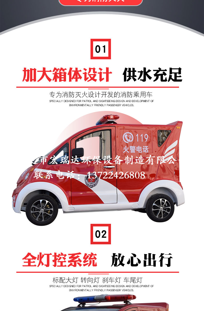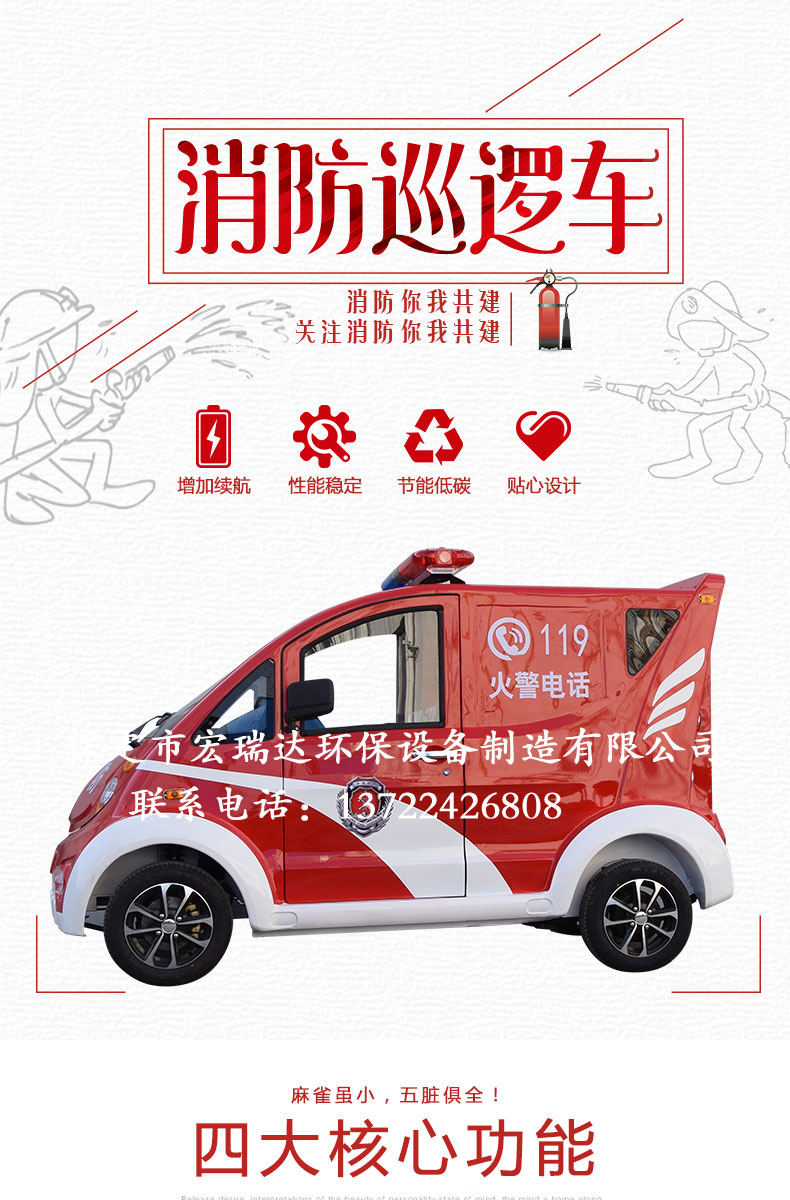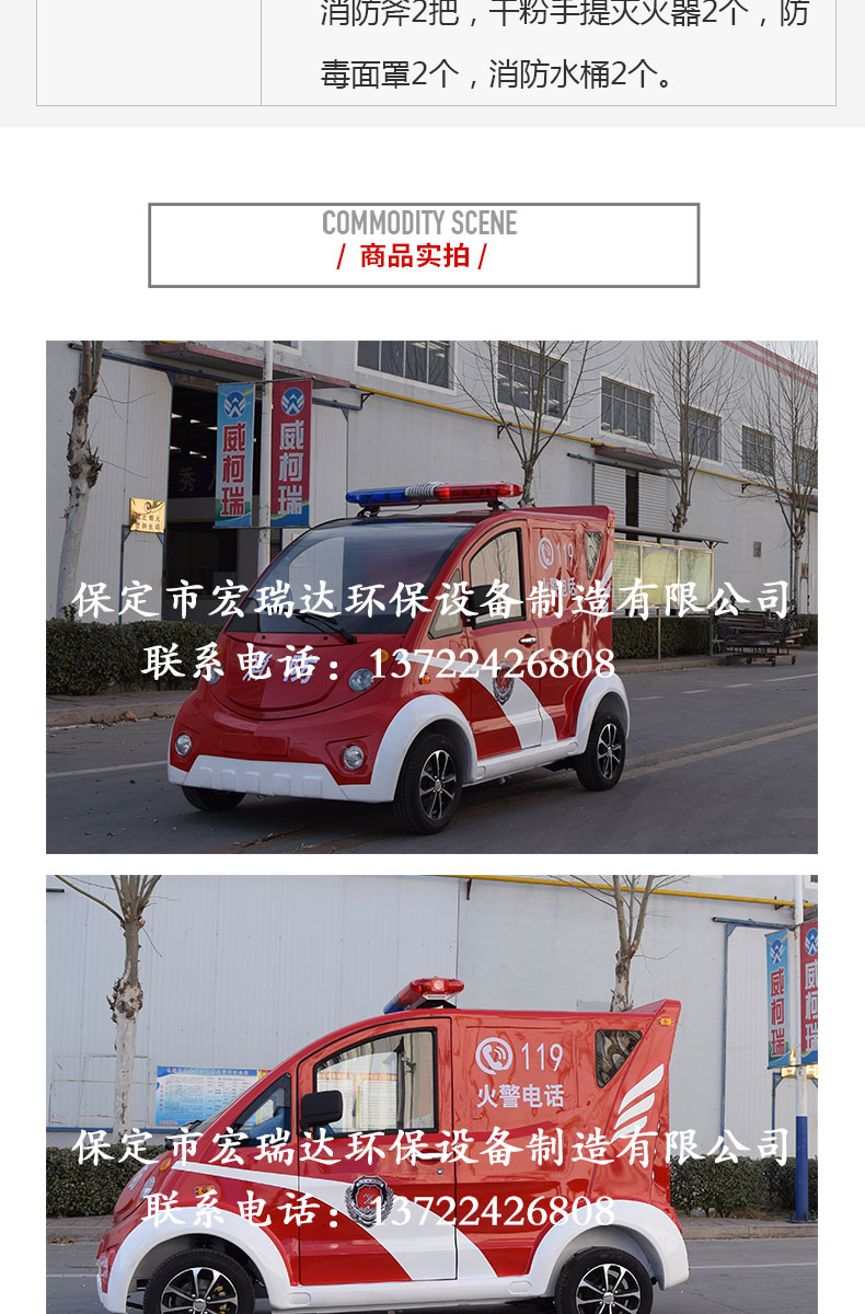 - 電動(dòng)消防車是普通消防車的縮小版,也稱作小型消防車,迷你消防車 微型消防車是宏瑞達(dá)新研發(fā)生產(chǎn)的新能源產(chǎn)品。因?yàn)樗?qū)動(dòng)方式為直流電機(jī)驅(qū)動(dòng),不需加油,就可以行駛滅火車上配有高壓水泵1臺(tái),另配有消防斧、消防錘、消防鉗及2套干粉滅火器等滅火工具。